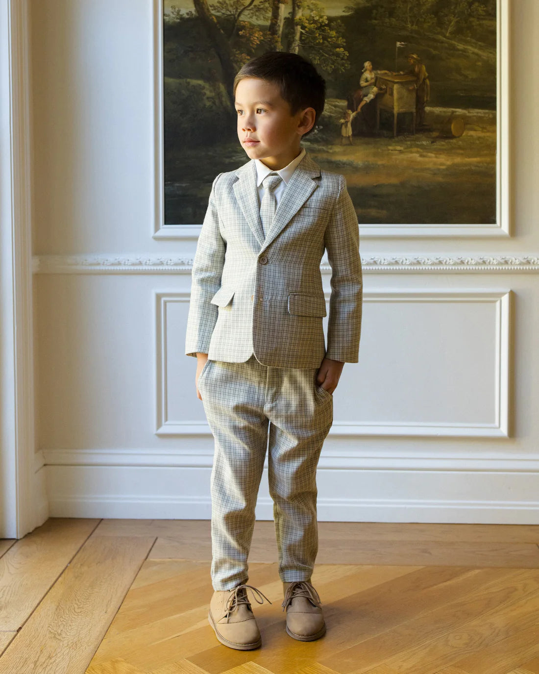This single-breasted jacket in classic houndstooth features sharp notched lapels, marbled buttons, and front pockets, finished with a vent at the back for your little gentleman to move with ease....