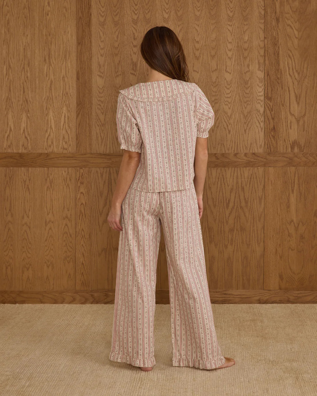 Our Ruffle Pajamas are the perfect blend of cute and cozy. This woven pajama set features a charming ruffle-collar top paired with wide-leg pants designed with an elastic waistband for...
