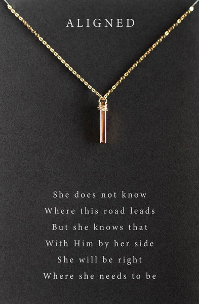 This piece includes a wired wrapped 15mm bar pendant. Chain and pendant are gold plated over brass. 18" Chain