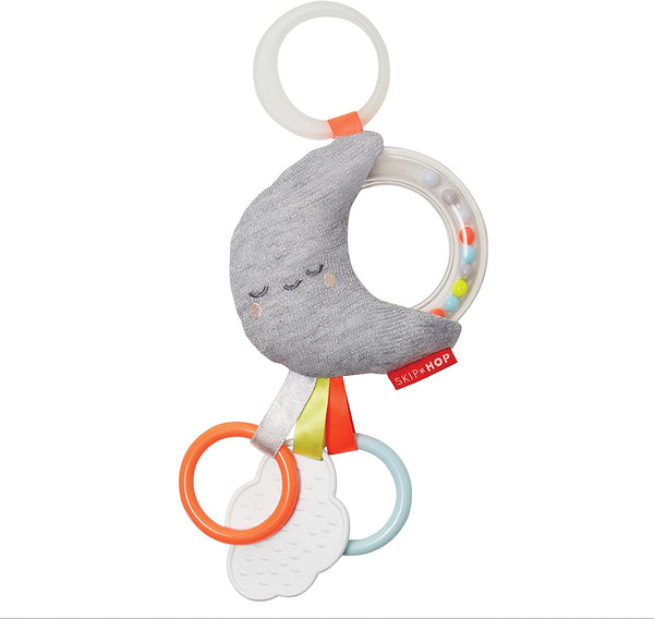 Our sleepy moon friend features neon rattle beads to stimulate baby's auditory and visual senses. With a textured, cloud-shaped teether and sweet embroidered details, it's sure to be one of your little's one go-to baby toys. Like all our stroller toys, it has a built-in loop so you can easily attach it to the bar of your stroller, infant carrier or other gear.