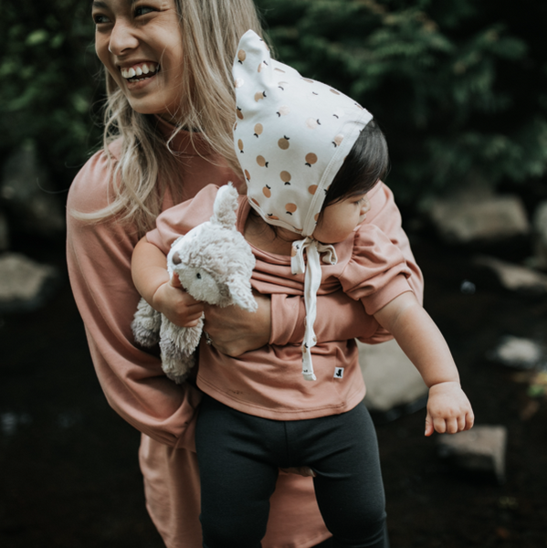 This adorable vintage-inspired bonnet is the perfect hat for a chilly Fall day. It is fully lined with organic cotton fleece for added warmth and softness. This brimless bonnet has all the benefits of a beanie with added ties so it stays in place on your littles!