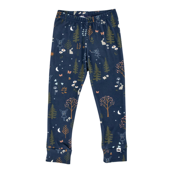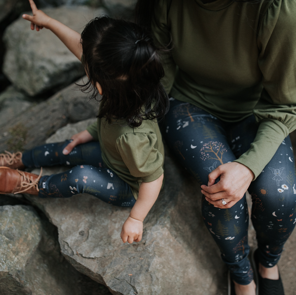 Our leggings are made out of super soft pre-shrunk bamboo/cotton jersey fabric and feature a 'pitched' waistband that is higher in the back than in the front to offer ample room for diapers (yes, even cloth diapers). The extra diaper room is removed for the bigger kid sizes, 2T - 6T.