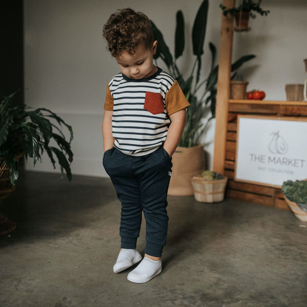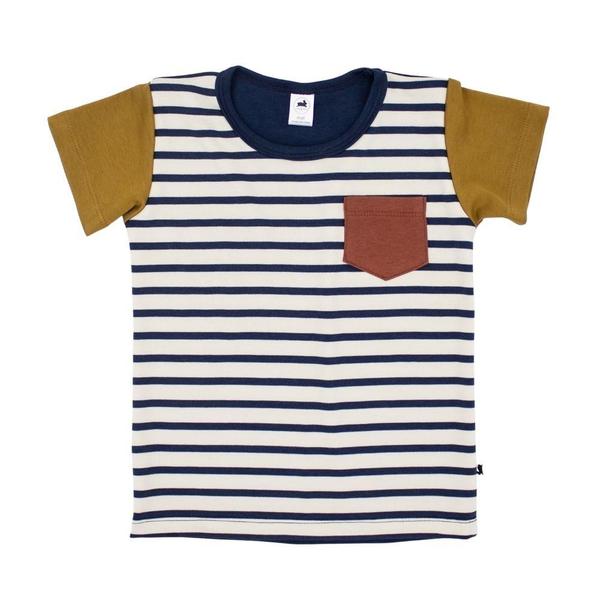 Taking a spin on the classic Breton Stripe, for your playful littles - featuring a cute little brick pocket and umber sleeves!