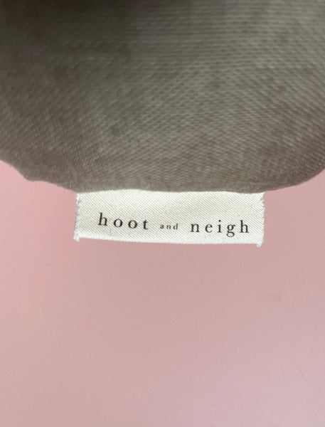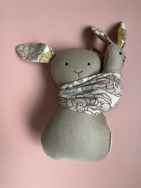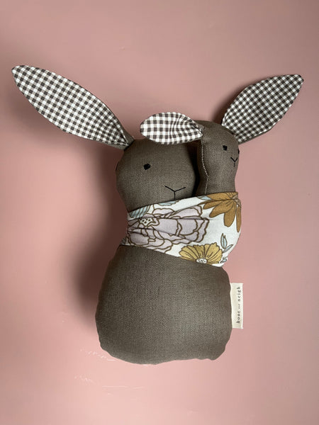 Precious handmade mama and baby bunny in wrap from brand Hoot and Neigh. Bunnies are crafted with linen fabric and have gingham and floral accents. 🐰🐇