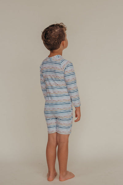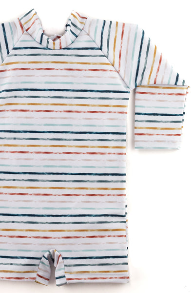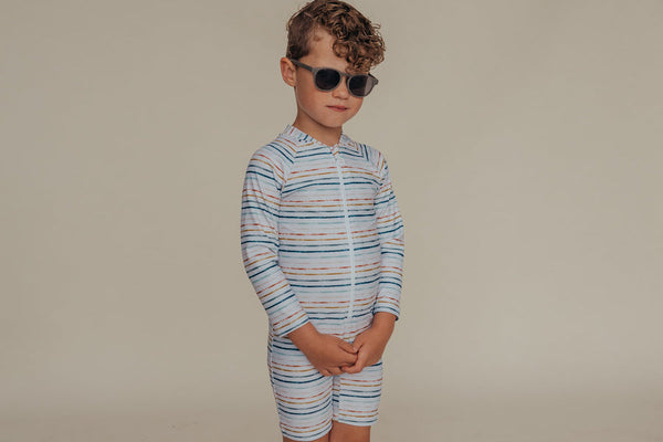 Keep your child safe from the sun without compromising on style! Our popular sunsuits combine the full protection of a Rash Guard with play friendly shorts into a convenient one piece swimsuit.  The lengthened zipper ensures these suits are easy on and off, with zipper pulls perfectly designed for little fingers.  Potty breaks are a breeze! Our suits are fully reversible allowing for zipper wear at the front or back, and help empower your little ones to dress and undress themselves!