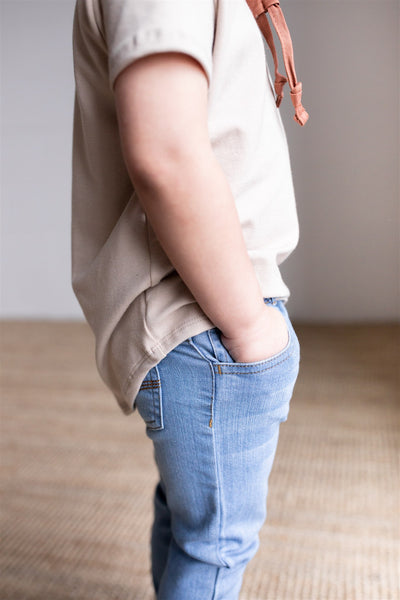 Introducing our new Kids Stretchy Denim! These kids jeans are ethically and sustainably made overseas and feature an elastic waistband and functional pockets! This staple light wash will be your go-to denim this season!