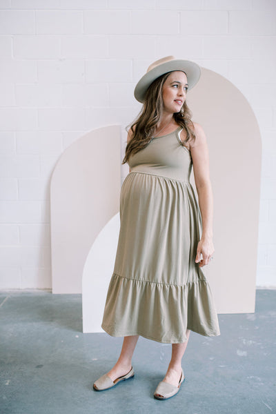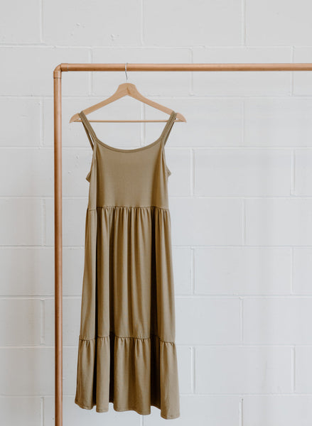 The Midi Dress is back! This boho style dress features a ruffled hem and hits slightly below the knee.