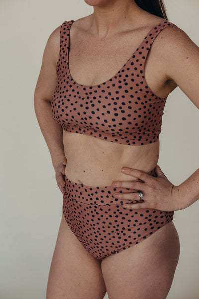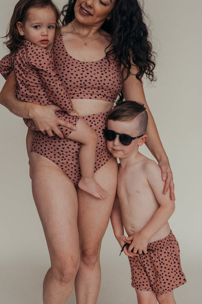 Our "Lennon" print features hand drawn irregular dots playfully arranged on a rich clay tone base. This print is more brown than red, and is very warm + earthy. Pair this sunsuit with our bold black on black, earthy sage green or lilac accessories. You can also shop this print in our full family matching.