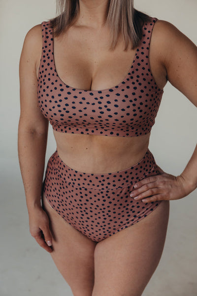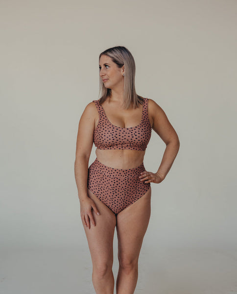 The scoop neck top offers medium support woven right into the top, with moderate coverage on the front and a lower scoop at the back. The top is fully lined and offers easy access for nursing! With 18% Lycra this suit stretches and moves with your body ensuring a custom fit for you.