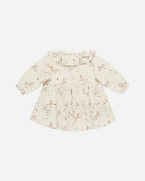 Soft baby dress with tiers, long sleeves, and cute ruffled collar along the neck. It snap buttons along the center front for easy changing as well also. All baby sizes includes our gathered bloomers!