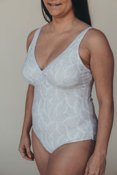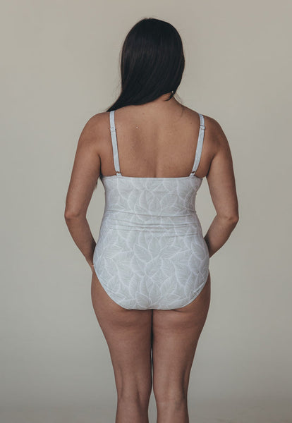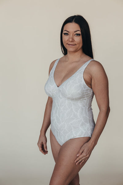 Similar to our High Waist Bikini Sets, this suit features an ultra soft + stretch fabric blend allowing it to move and adjust to your unique body exactly as it is.  Our unique design allows for excellent breast support and coverage with a great V-Neck design.  Feel comfortable and secure in this suit all day long - with excellent nursing access if needed!   The removable breast cups will offer additional modesty and support, and are capped off with a slimming stitching detail that sits across your rib cage providing a slimming detail.  The bottoms offer excellent coverage with our unique stay in place design.  The fabulous straps are adjustable and feature a metal clip ensuring the perfect fit every time.  We have used a thinner liner on this suit to ensure there is no bulk on the fit.