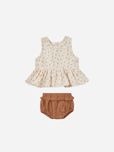 Our sleeveless peplum set includes a sleeveless tank with ruffle detail and button-back closure for easy changing. Coordinating bloomers have a matching ruffle detail with elastic at openings for the perfect fit.