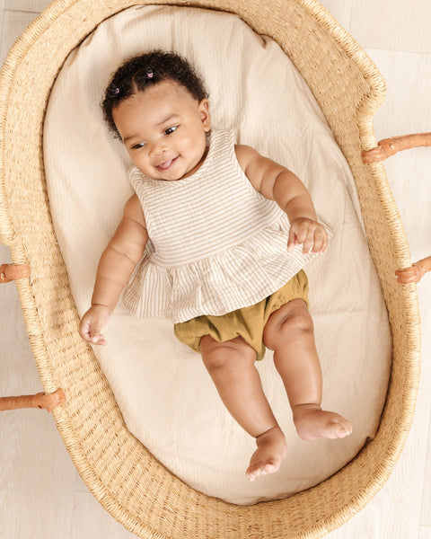 Our sleeveless peplum set includes a sleeveless tank with ruffle detail and button-back closure for easy changing. Coordinating bloomers have a matching ruffle detail with elastic at openings for the perfect fit.