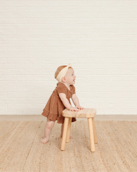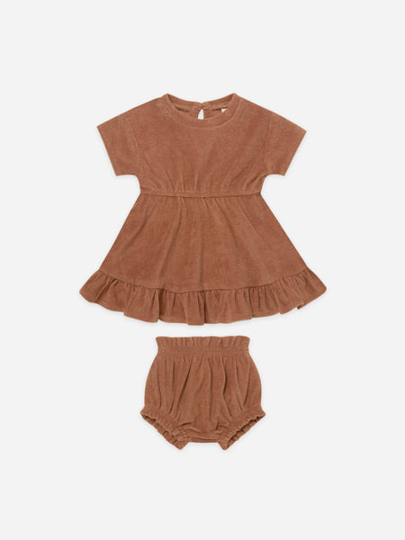 This sweet dress made of our terry cloth fabric features a ruffle trim at the bottom. It also includes an elasticized waist and a button keyhole closure for the perfect fit. *This season comes with a coordinating bloomer.