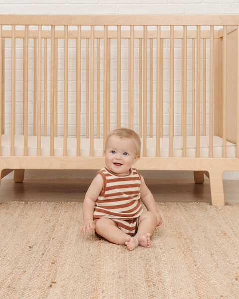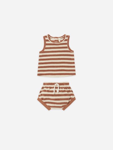 This terry tank + shortie set features a relaxed fit tank with snap back closure for easy changing + relaxed fit short with elastic waist, robe drawstring and ribbed leg openings for a perfect fit!