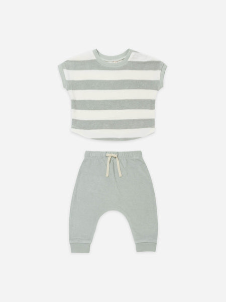 Our Terry Tee + Pant Set includes our boxy fit tee and comfy sweatpants with an elastic waistband and adjustable drawstring. Sizes 0-3m, 3-6m, 6-12m have snaps at the shoulder for easy changing.